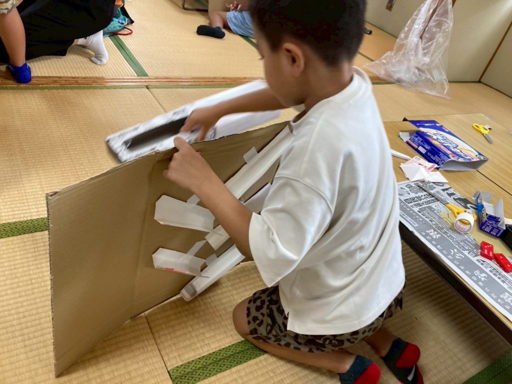 ゴールができたら、道を作って、大きな段ボールにそれを自由に貼り付けてみて、ちゃんとゴールまでビー玉が転がるように調整して。細めの厚紙に洗濯ばさみで作るカタカタ道も付けて、超大作を作った子もいたね👍最後は、作った作品を大きな袋に入れてお持ち帰り。