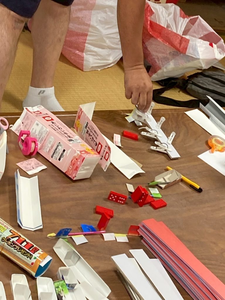 まずはゴールの旗🚩を作ってみる❗️ドミノにストローと折紙で作った旗をくっつけるんだけど、ドミノが倒れた時に旗が立つようにするには、どの角にどの向きで付けるか?角に細い棒をどう貼り付けるか?が難しそう💦もう一つのゴール、お菓子の箱の中に小さな箱をしこんでビー玉がきたら旗が立つ仕掛けは、ゆっくりだと止まってしまったりして、みんな苦戦してたね。